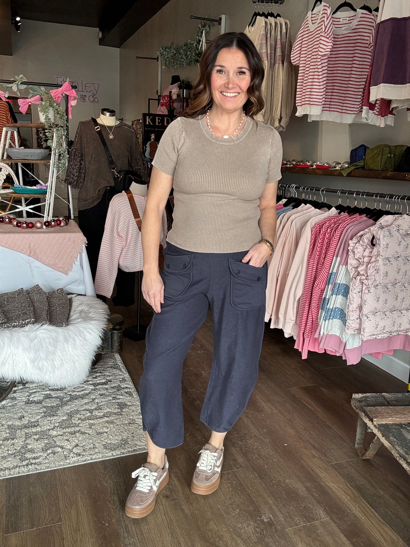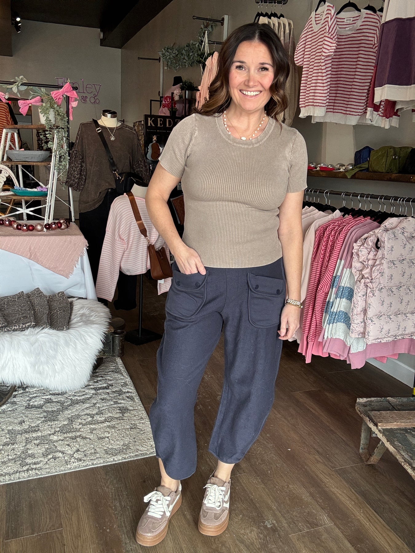 Slip into ultimate comfort with these navy barrel leg sweatpants that prove cozy doesn't have to mean boring. The high-waisted silhouette flatters while the elastic waistband keeps everything in place, and those hidden pockets? They're basically a superpower. Crafted from soft terry knit fabric, these pants are your new go-to for lounging, running errands, or pretending you're still in pajamas while looking put-together. Effortlessly stylish and ridiculously comfortable.