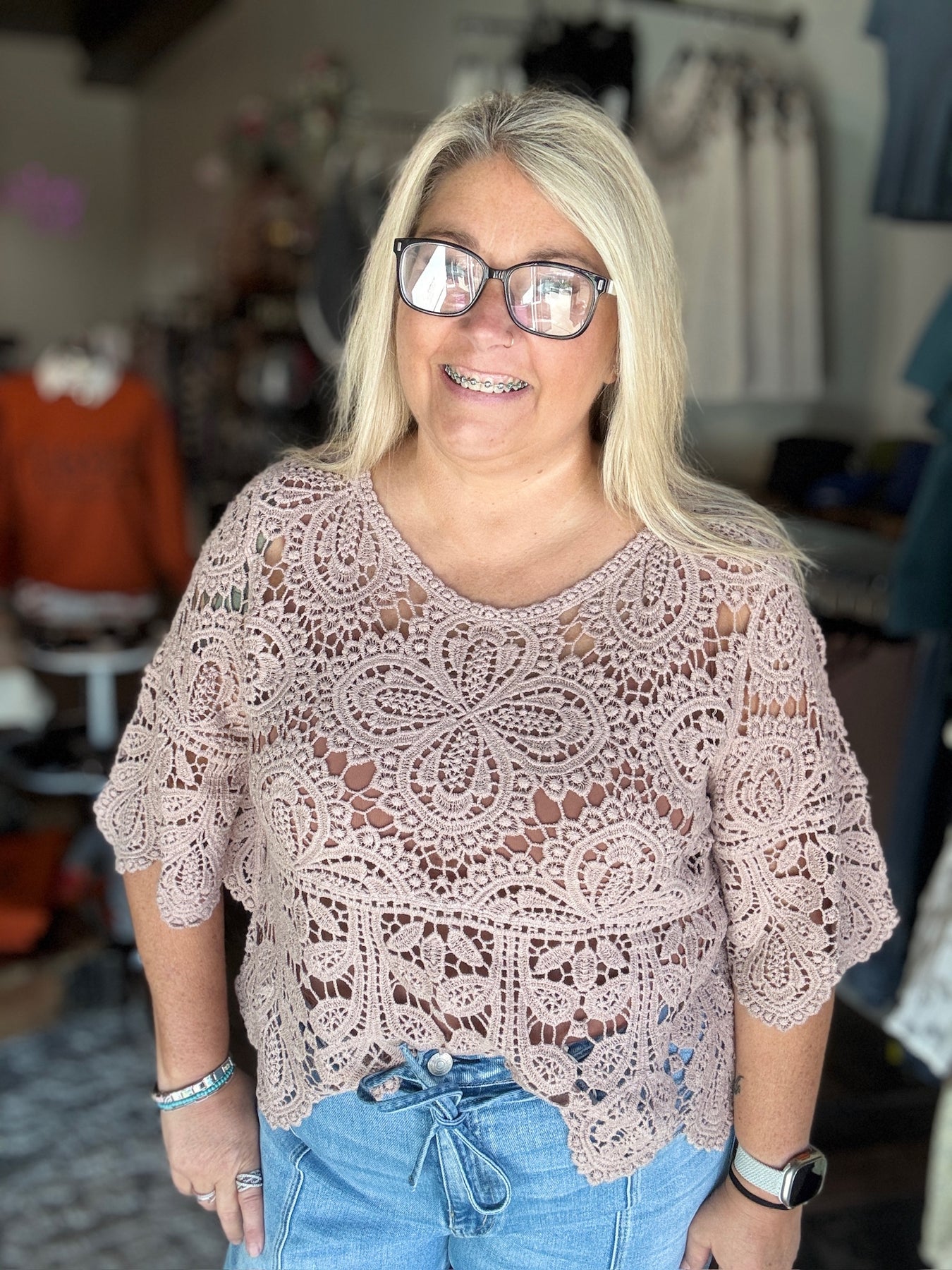 This taupe crochet lace top combines breezy charm with playful style. Featuring an open knit design and a flattering boat neckline, it offers a light, airy feel perfect for layering. The 3/4 wide bell sleeves add a fun, flirty touch, while the oversized fit ensures comfort with effortless cool. Ideal for casual outings or layering over your favorite camisole, this top brings a whimsical twist to your wardrobe.