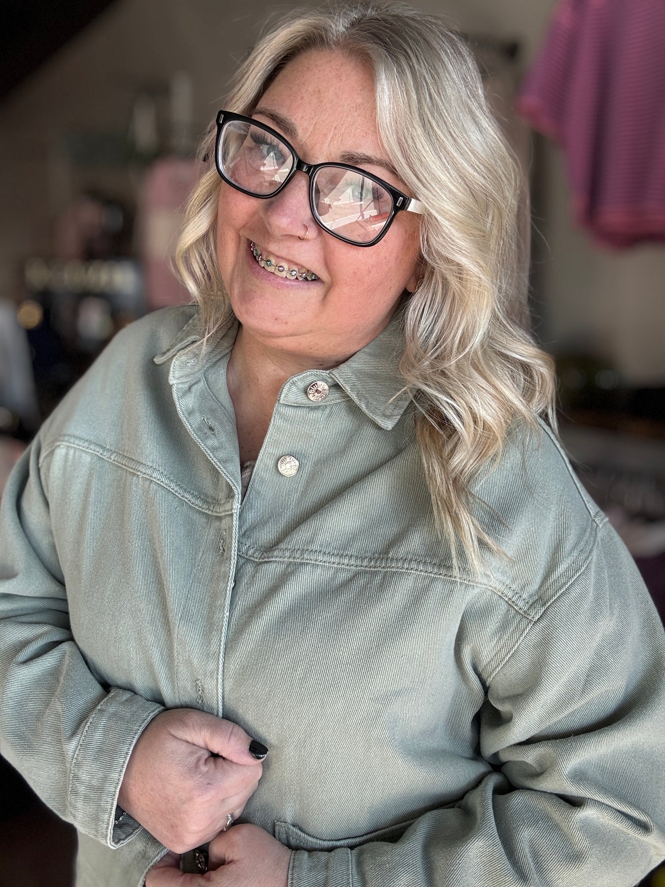 Embrace the season in this effortless sage green denim jacket that's basically a spring wardrobe essential. The relaxed, boxy silhouette drapes beautifully without clinging, while functional pockets keep your hands happy and your style on point. A curved hem adds just enough personality to elevate your everyday look, and the button-down front makes layering a breeze. Whether you're celebrating St. Patrick's Day or simply soaking up milder weather, this versatile piece transitions seamlessly from casual coffee runs to weekend adventures. Soft, comfortable, and undeniably chic—your new favorite jacket awaits.