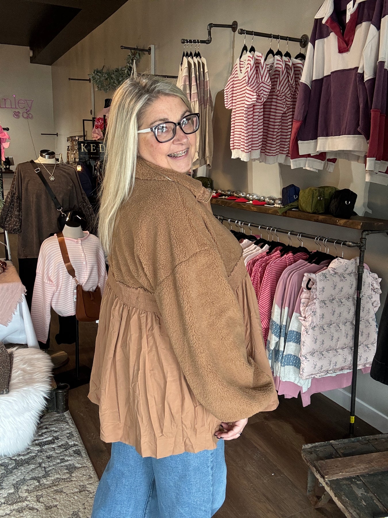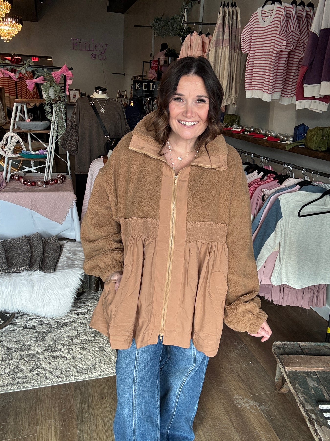 Wrap yourself in cozy charm with this Honey Fleece Babydoll Jacket—a playful twist on the classic zip-up! Crafted from soft fleece on top with contrasting details, this babydoll silhouette features a fun flared fit that's equal parts trendy and comfortable. Perfect for layering, it delivers all the warmth you need without the boring factor. Whether you're running errands or hanging out, this jacket brings personality and coziness to any outfit.