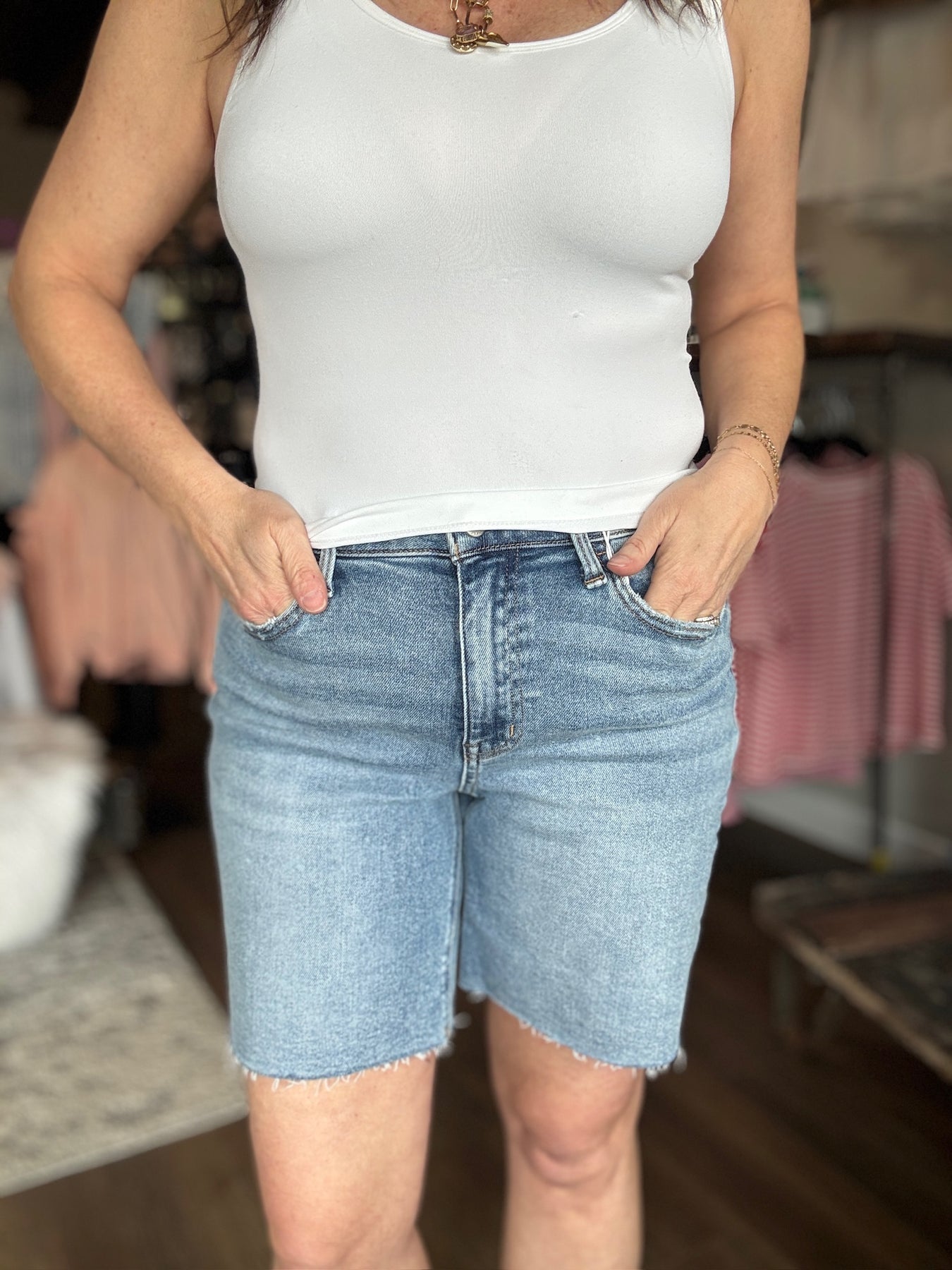 These high-rise bermuda shorts deliver the perfect balance of style and comfort for warm-weather wear. Featuring a flattering high-rise fit and bermuda length that offers extra coverage, they're ideal for those who prefer shorts with more length. The comfort stretch fabric moves with you throughout the day, while the lightly distressed details and raw hem add an effortlessly cool edge. A versatile spring and summer essential that works for any occasion.