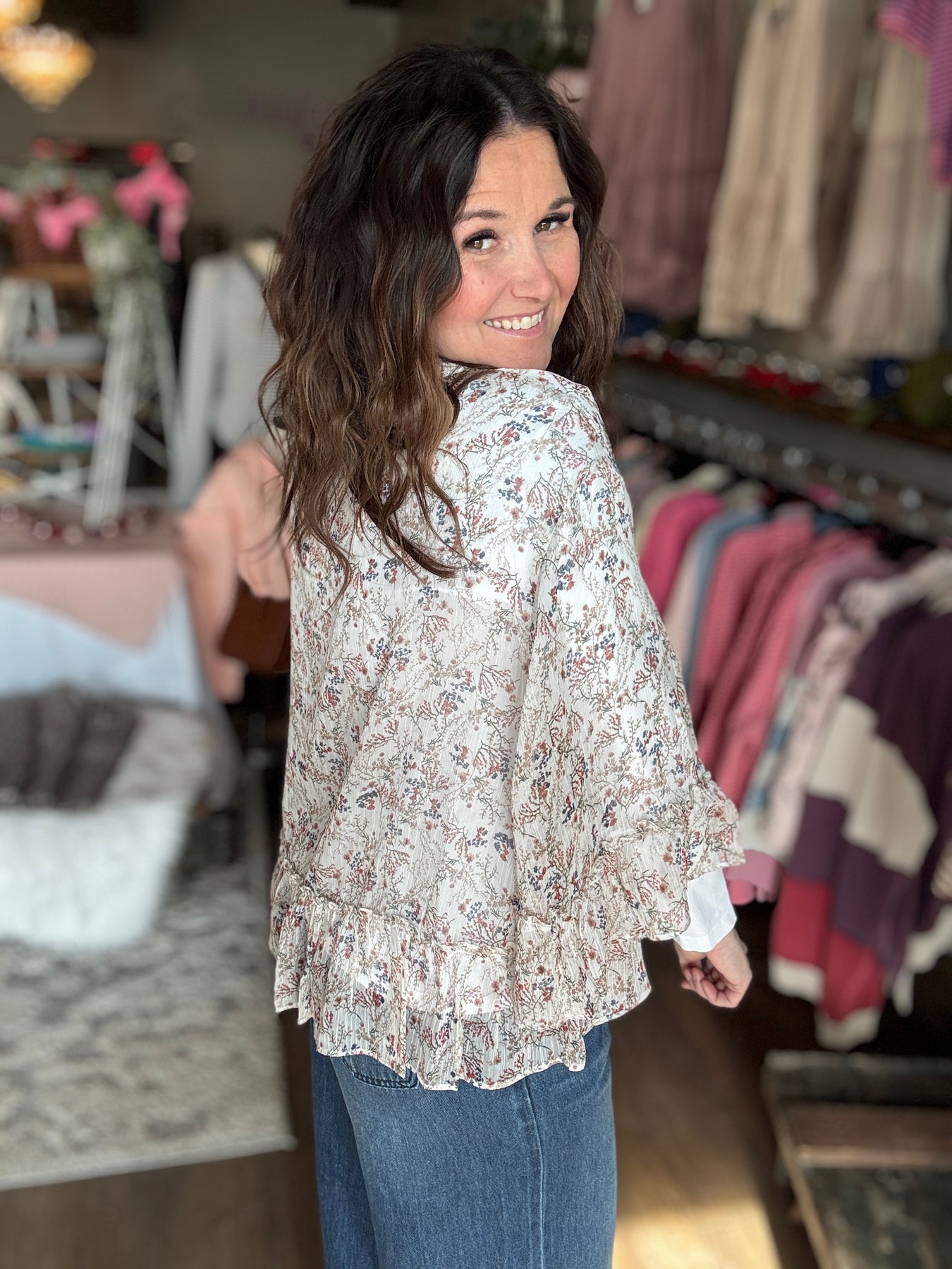 Twirl into spring with this gorgeous floral printed kimono that's as breezy as a garden stroll. The sheer, lightweight fabric drapes effortlessly over your favorite outfits, while delicate 3/4 sleeves keep things just right for warming weather. A charming ruffle hem adds a playful flutter with every step. Layer it over a dress, toss it over a tank—this versatile piece is your new go-to for that effortless, romantic vibe all season long.
