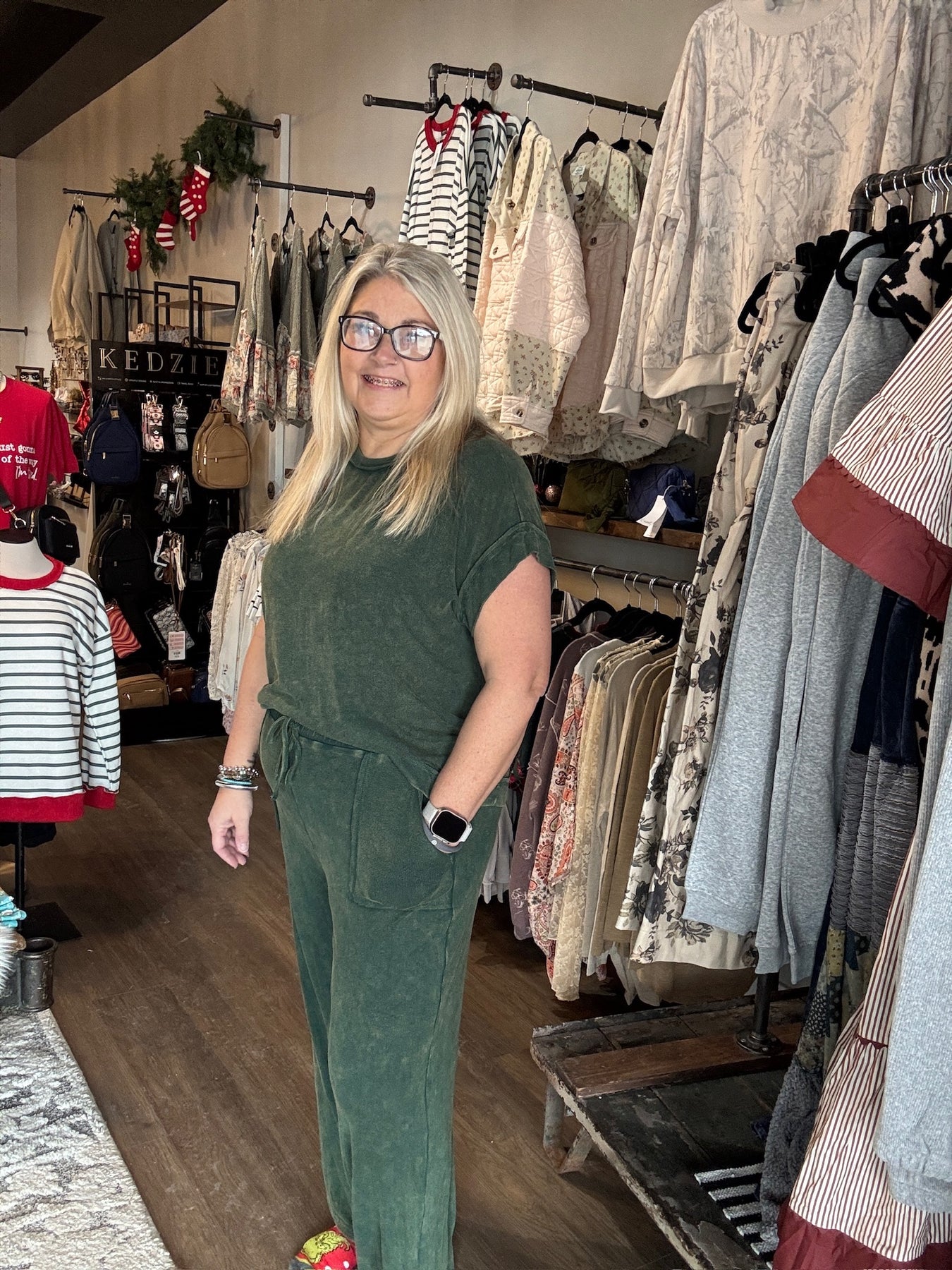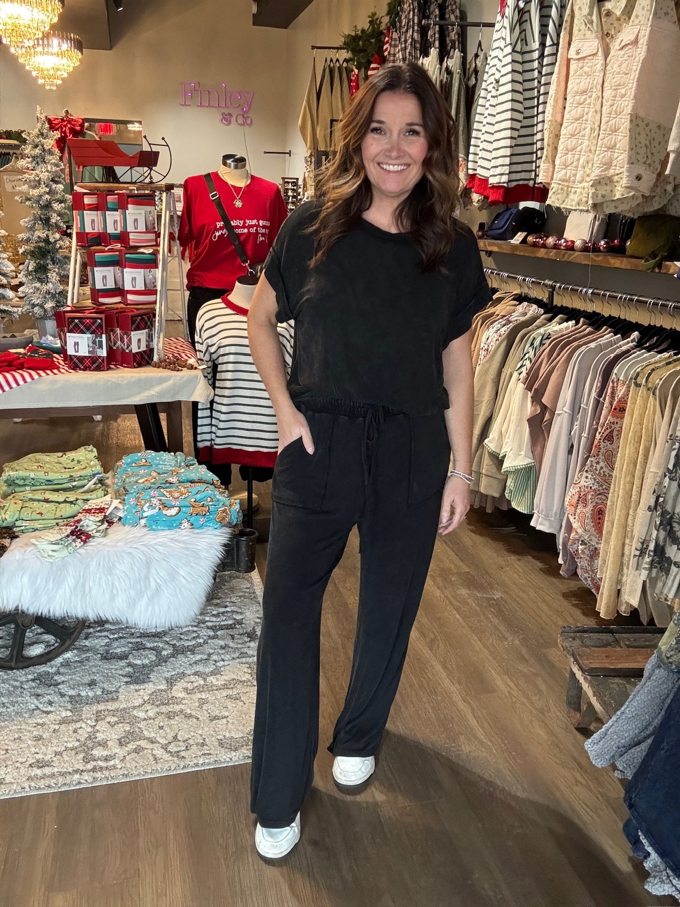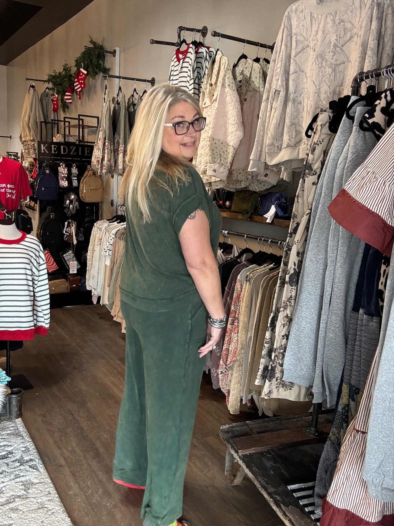 Slip into ultimate comfort with this mineral wash ribbed lounge set—your new favorite excuse to stay cozy all day. Featuring a relaxed round neckline, oversized silhouette, and wide-leg pants with an elastic waistband and drawstring, this set is basically a warm hug you can wear. The ribbed texture adds subtle dimension while the mineral wash gives each piece that effortlessly cool, lived-in vibe. Available in moody hunter green and classic black, it's the kind of set that works for lounging, running errands, or pretending you're on vacation. Pure comfort, zero compromises.
