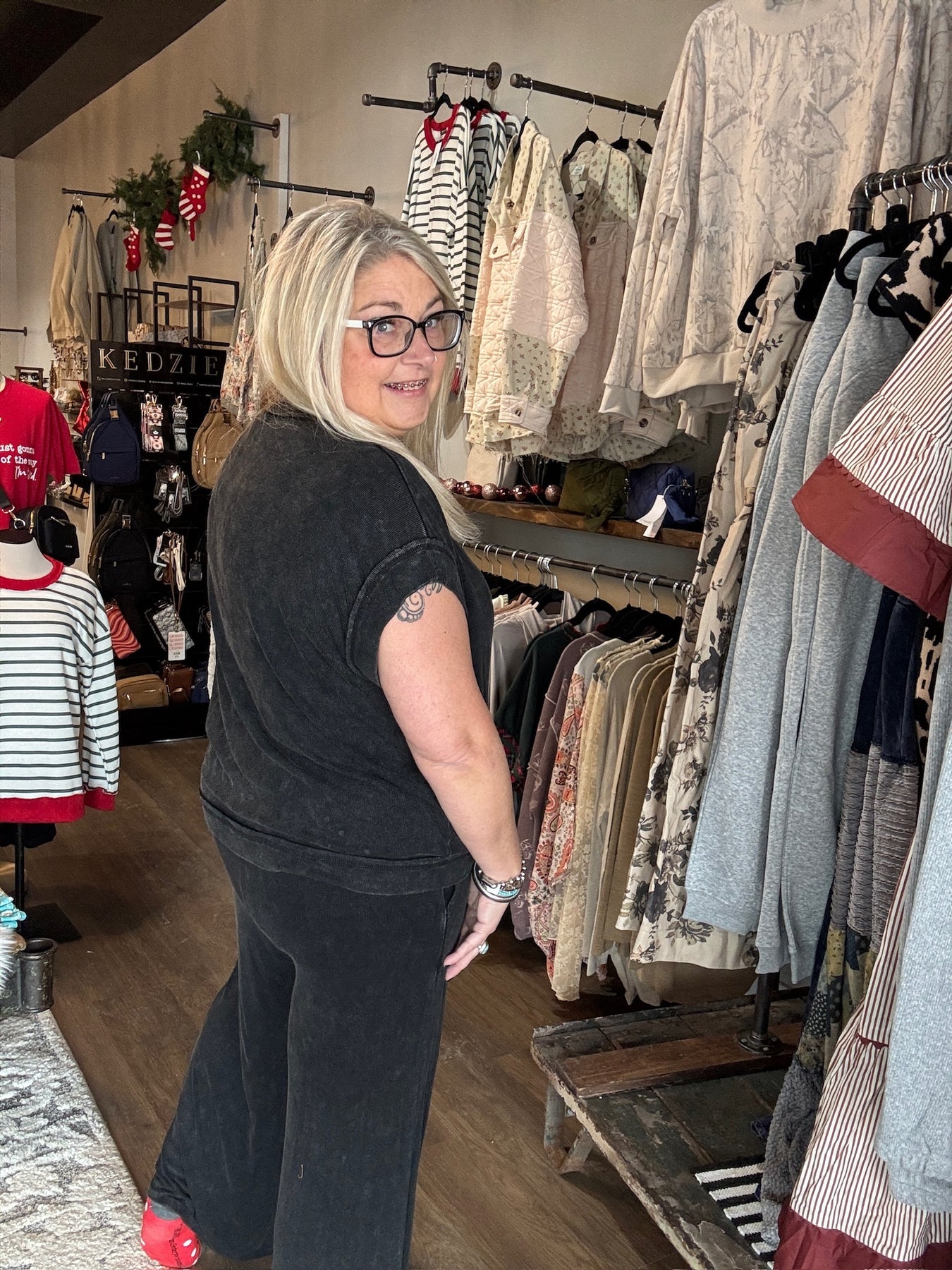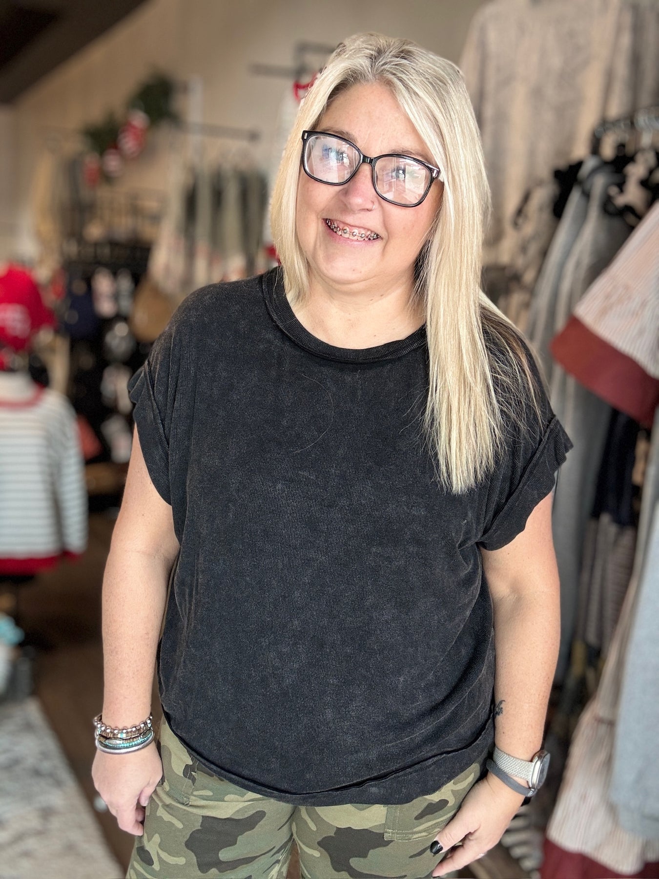 Angela: (Blonde) is 5'5" and her normal size is an XL or 1x top, a size 14W/15 pant, and a 1x in shorts