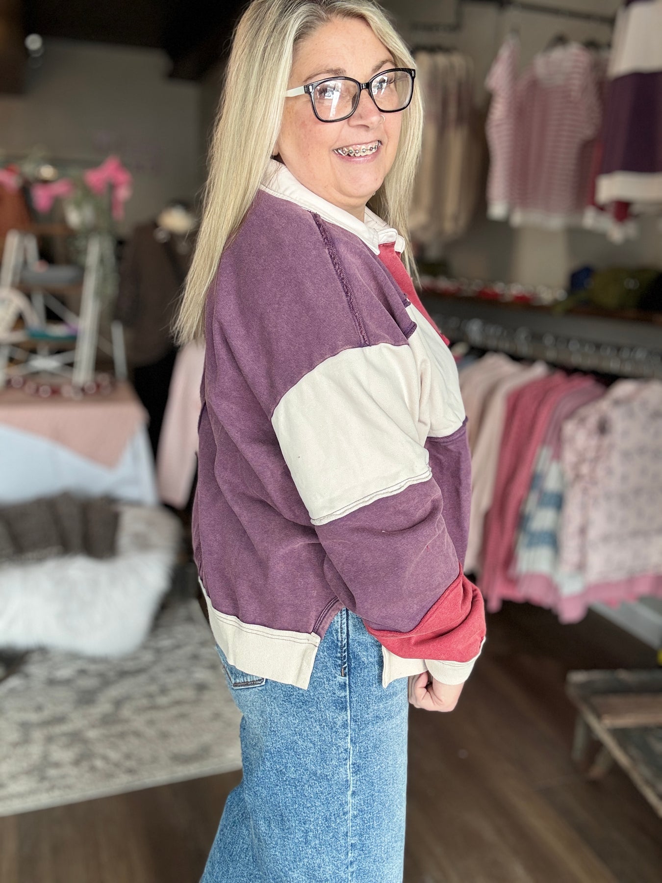 Step into the '80s with this charming retro polo that's giving major vintage vibes. Featuring a bold pink and purple colorblock design, this relaxed-fit top combines a classic collared neckline with a flattering V-neck for effortless style. Perfect for channeling nostalgic cool or adding a fun pop of color to your Valentine's Day look. Whether you're pairing it with high-waisted jeans or vintage-inspired skirts, this playful piece brings retro flair to any outfit.