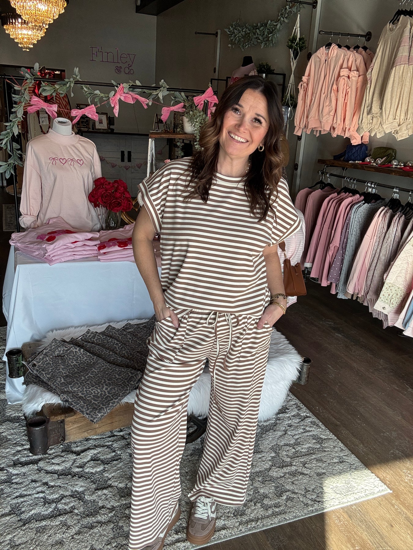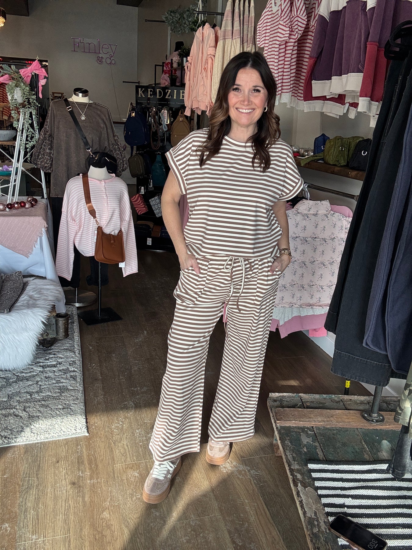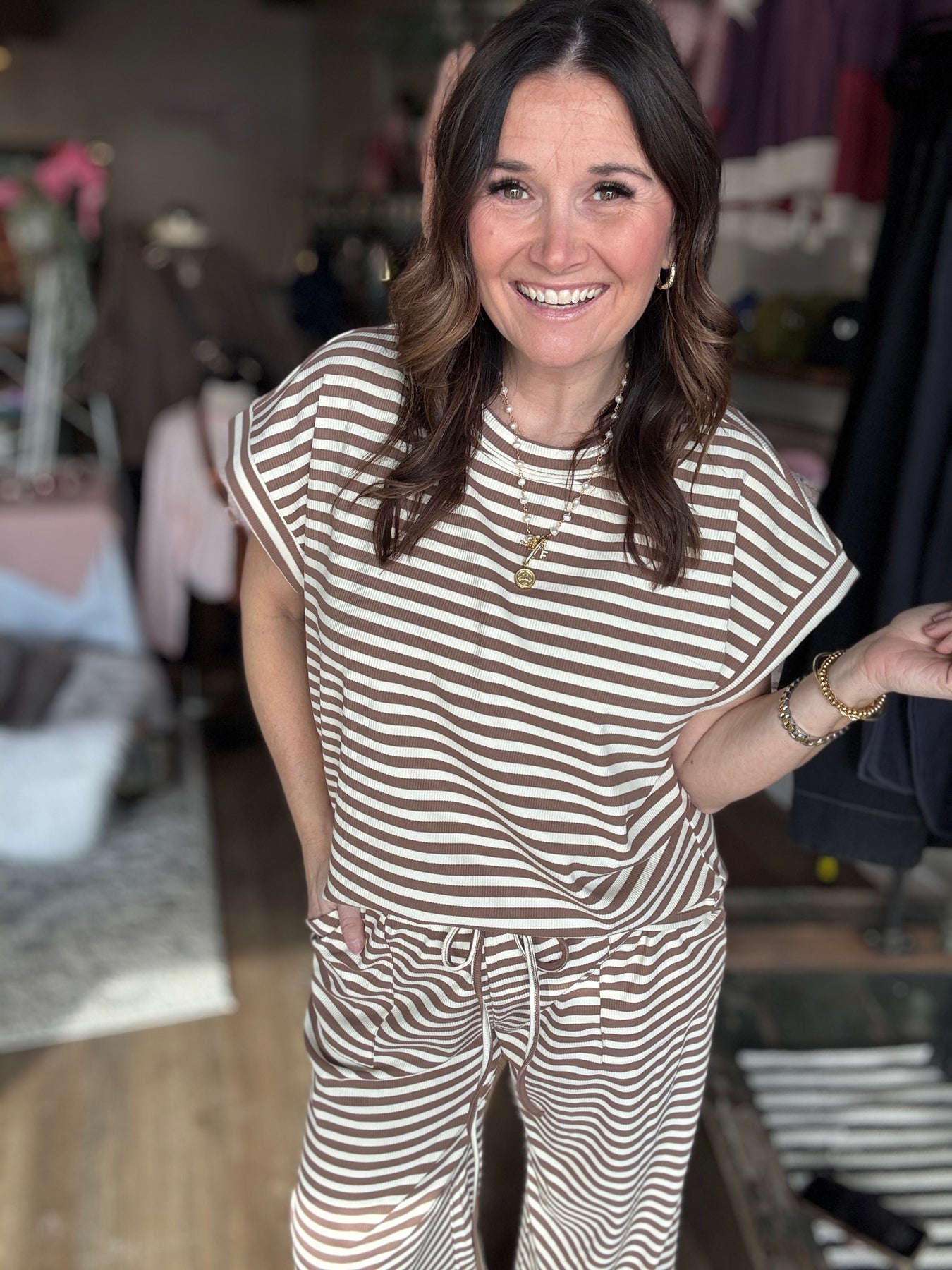 Effortless comfort meets laid-back style with this tan striped set. The ribbed, breathable short-sleeve top pairs perfectly with relaxed wide-leg pants featuring an elastic waistband and drawstrings for an adjustable fit. Whether you're lounging at home or running weekend errands, this cozy duo delivers the perfect balance of ease and put-together polish. Slip it on and feel the difference quality comfort makes.