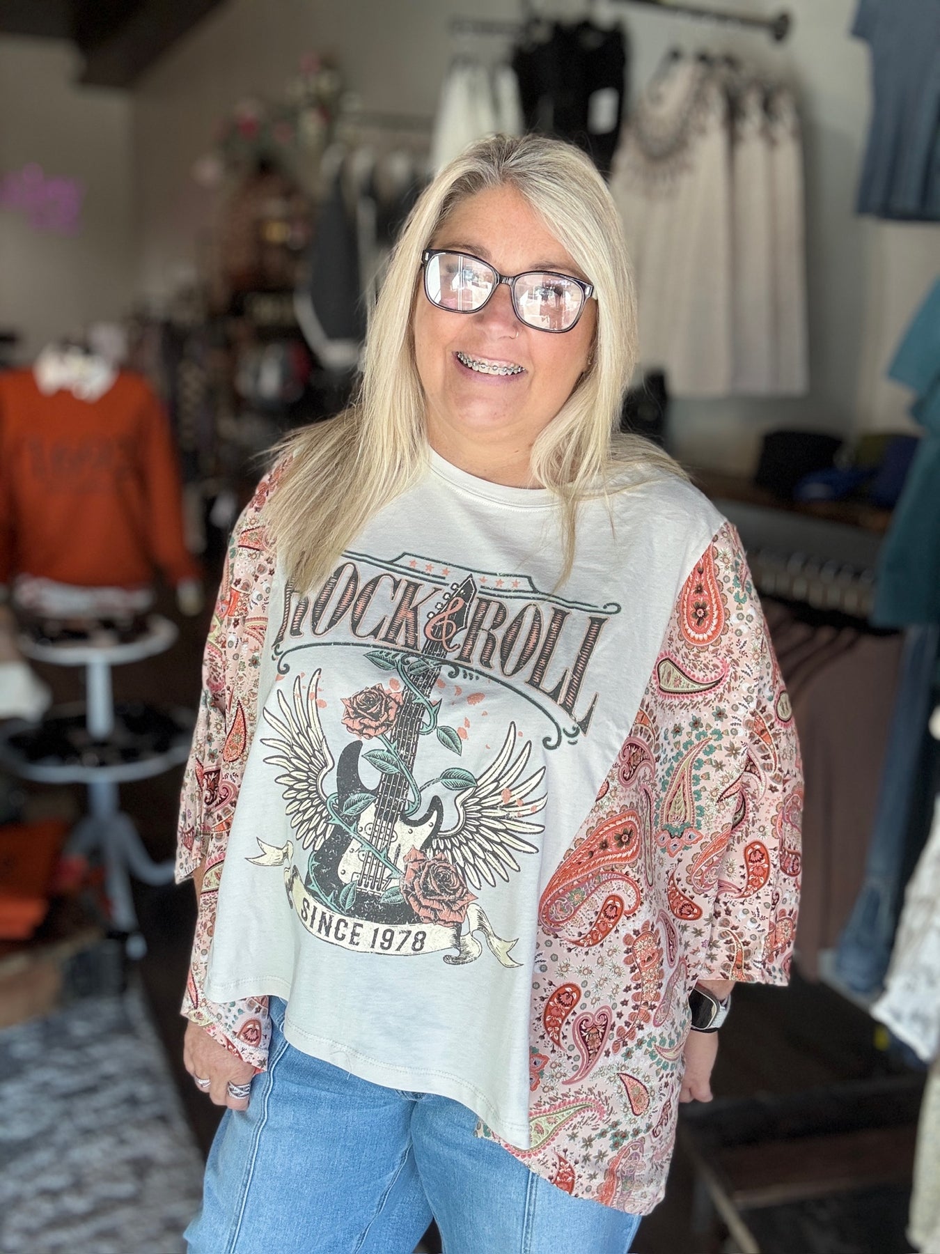 Embrace your wild side with this Rock & Roll Boho Tee, featuring a bold rock & roll graphic and playful paisley boho sleeves. Perfect for adding a fun, free-spirited vibe to any outfit, this top blends edgy rock style with relaxed boho charm. Dress it up or down for effortless cool wherever you go.