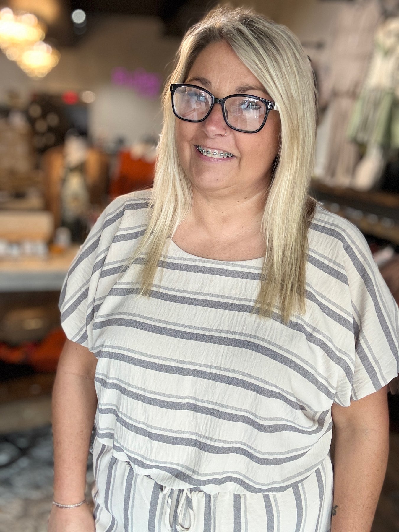 Step out in style and comfort with this Taupe Striped Set. The top features a playful bubble hem and a cozy crew neckline, perfectly paired with straight-leg pants that have an elastic waistband with a drawstring for an adjustable fit. Practical pockets add a touch of convenience to this effortlessly chic ensemble.