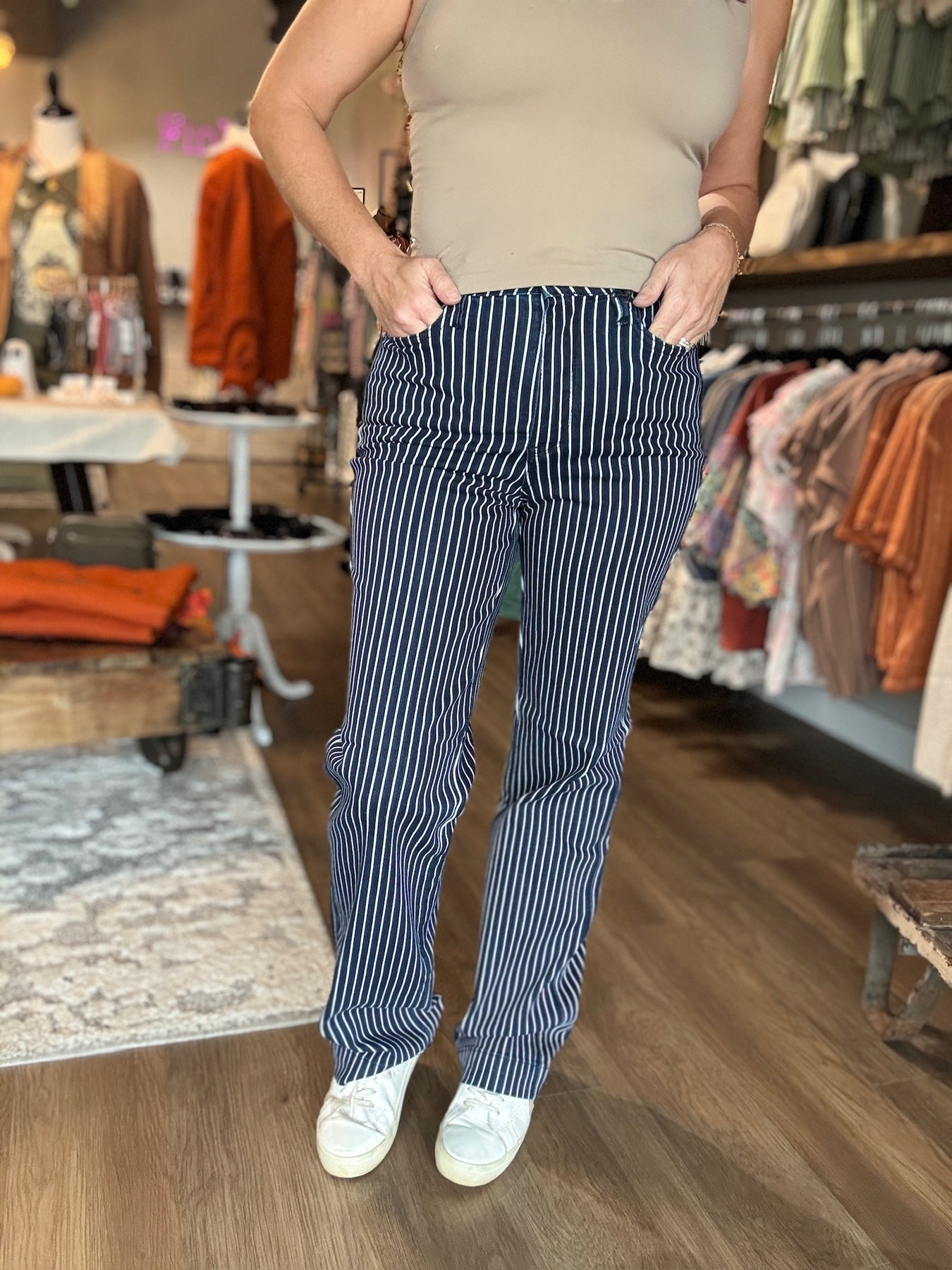 Elevate your denim game with these high-waisted Judy Blue Striped Straight Jeans. Featuring a flattering tummy control fit and just the right amount of stretch, they offer comfort and confidence all day long. The playful striped design adds a fresh twist to any outfit, making these jeans your new go-to for casual fun with a stylish edge.