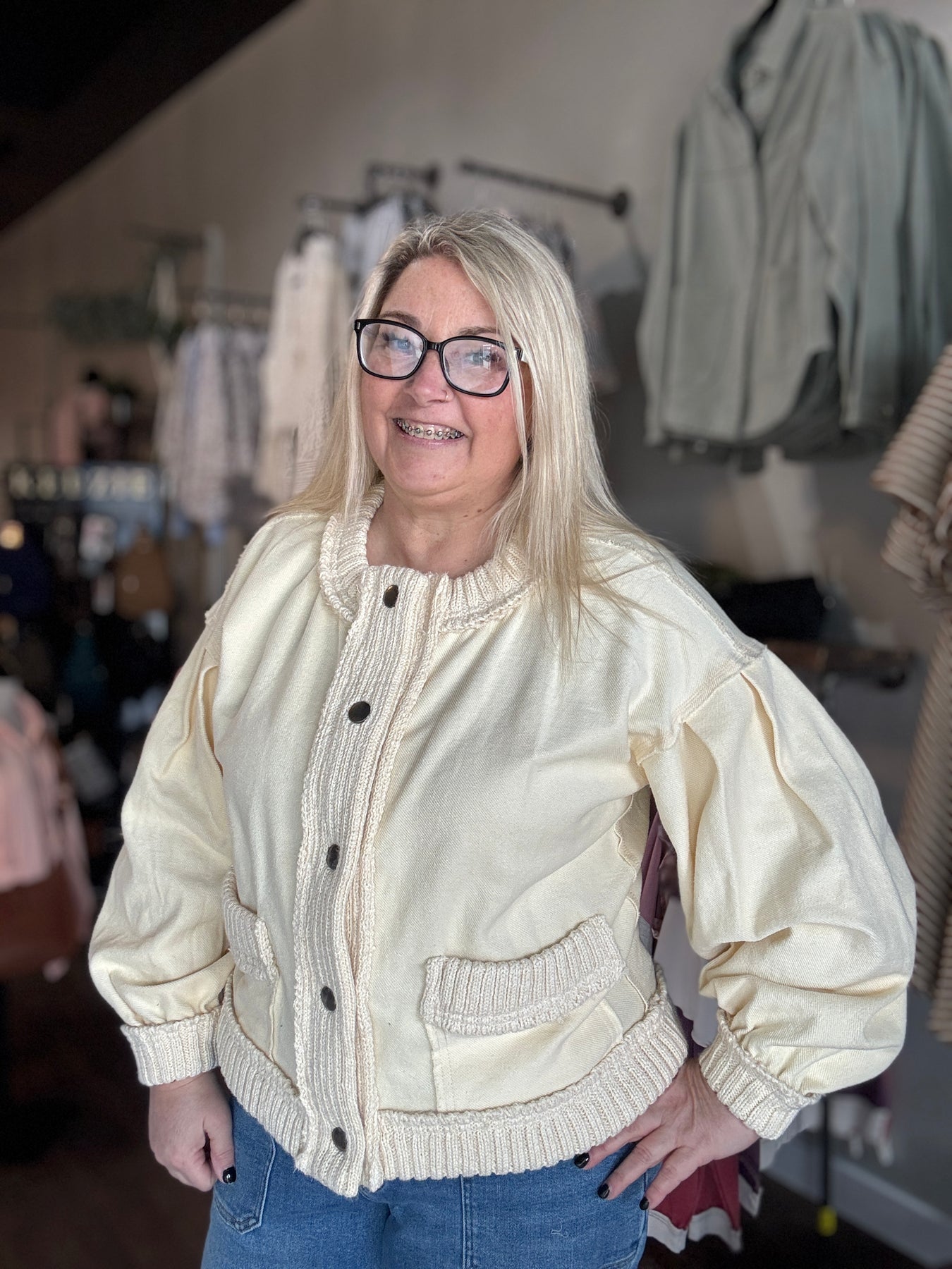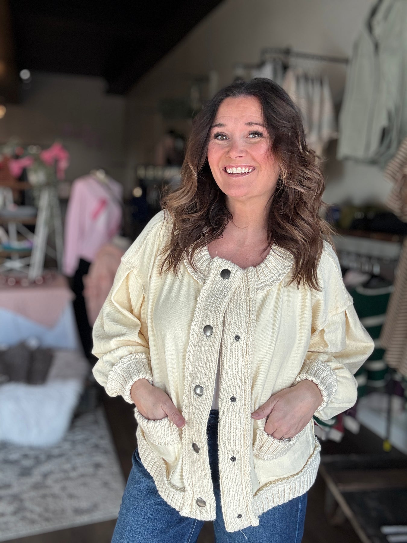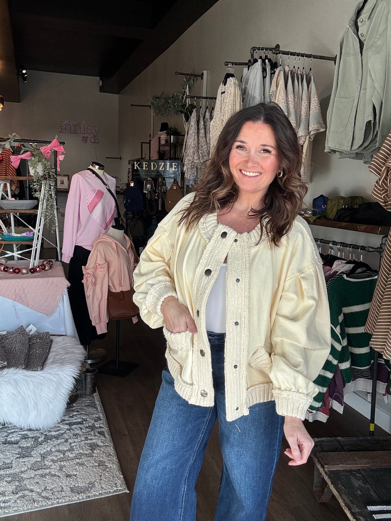 Throw on this oversized cardigan and embrace the season's best vibe. Crafted from smooth midweight fabric with cozy ribbed knit trim, it's the ultimate transitional piece that takes you from chilly mornings to warmer afternoons. The relaxed fit feels effortlessly cool, while practical pockets add function to the fun. Finished in a cheerful off-white and light yellow blend, it's the kind of jacket that makes getting dressed feel like a breeze.
