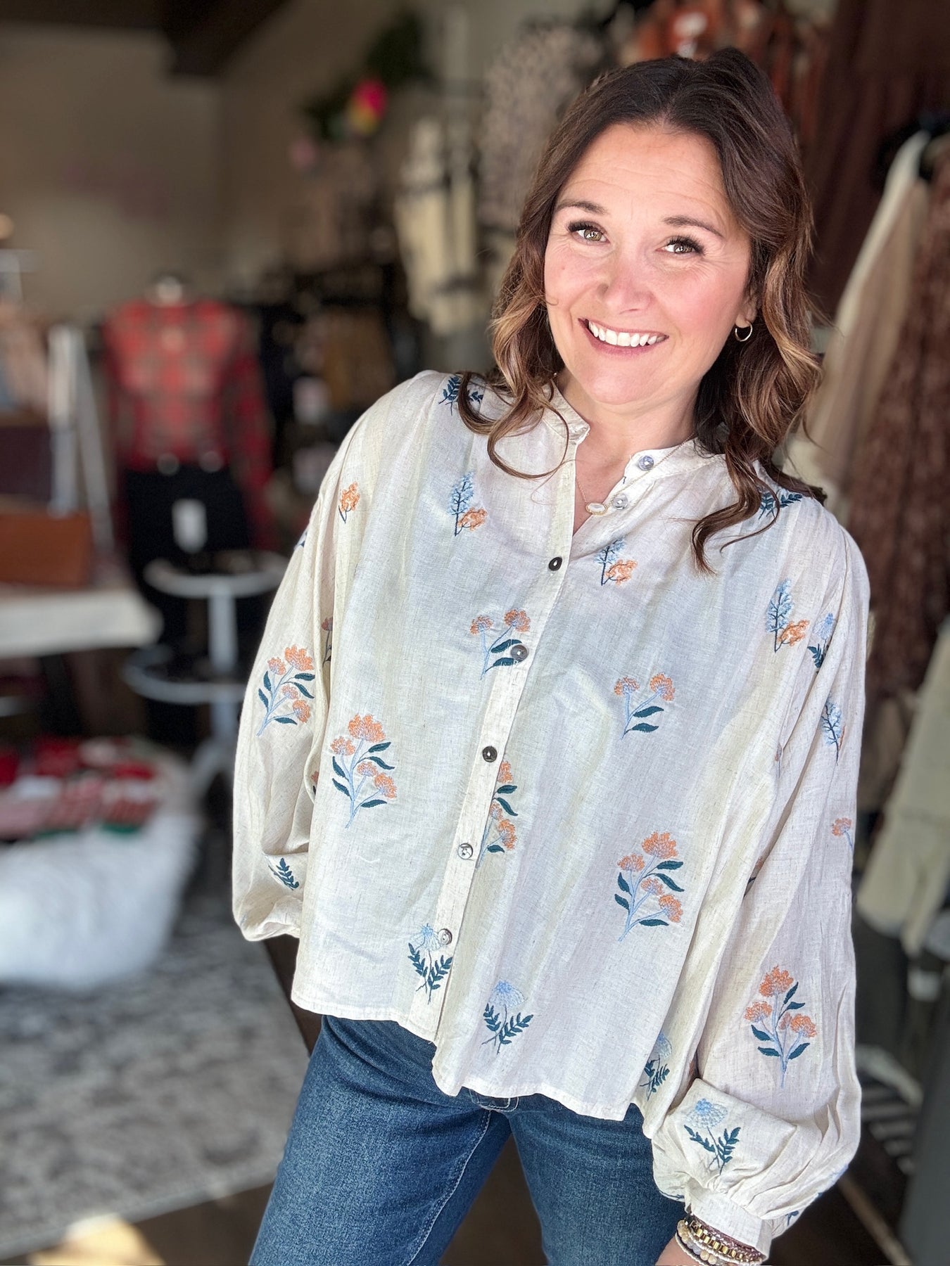 This oatmeal-colored blouse features a charming button-up front adorned with a cute floral design, making it the perfect playful addition to your fall wardrobe. Lightweight and effortlessly stylish, it’s ideal for layering or wearing on its own as the seasons change. Embrace cozy vibes with this delightful floral top that pairs beautifully with your favorite jeans or skirts.