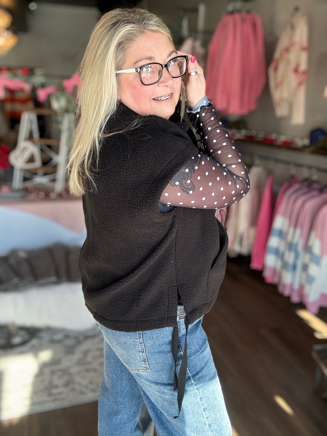 Wrap yourself in cloud-like comfort with this cozy black fleece vest! Crafted from ultra-soft sherpa fleece, it's the ultimate layering piece for chilly days. The sleeveless design pairs effortlessly over any winter outfit, while convenient snap closures and roomy pockets keep things practical. An adjustable drawstring at the hem lets you customize the fit for that perfect cozy silhouette. Whether you're bundling up for outdoor adventures or adding warmth indoors, this vest is your new go-to favorite.