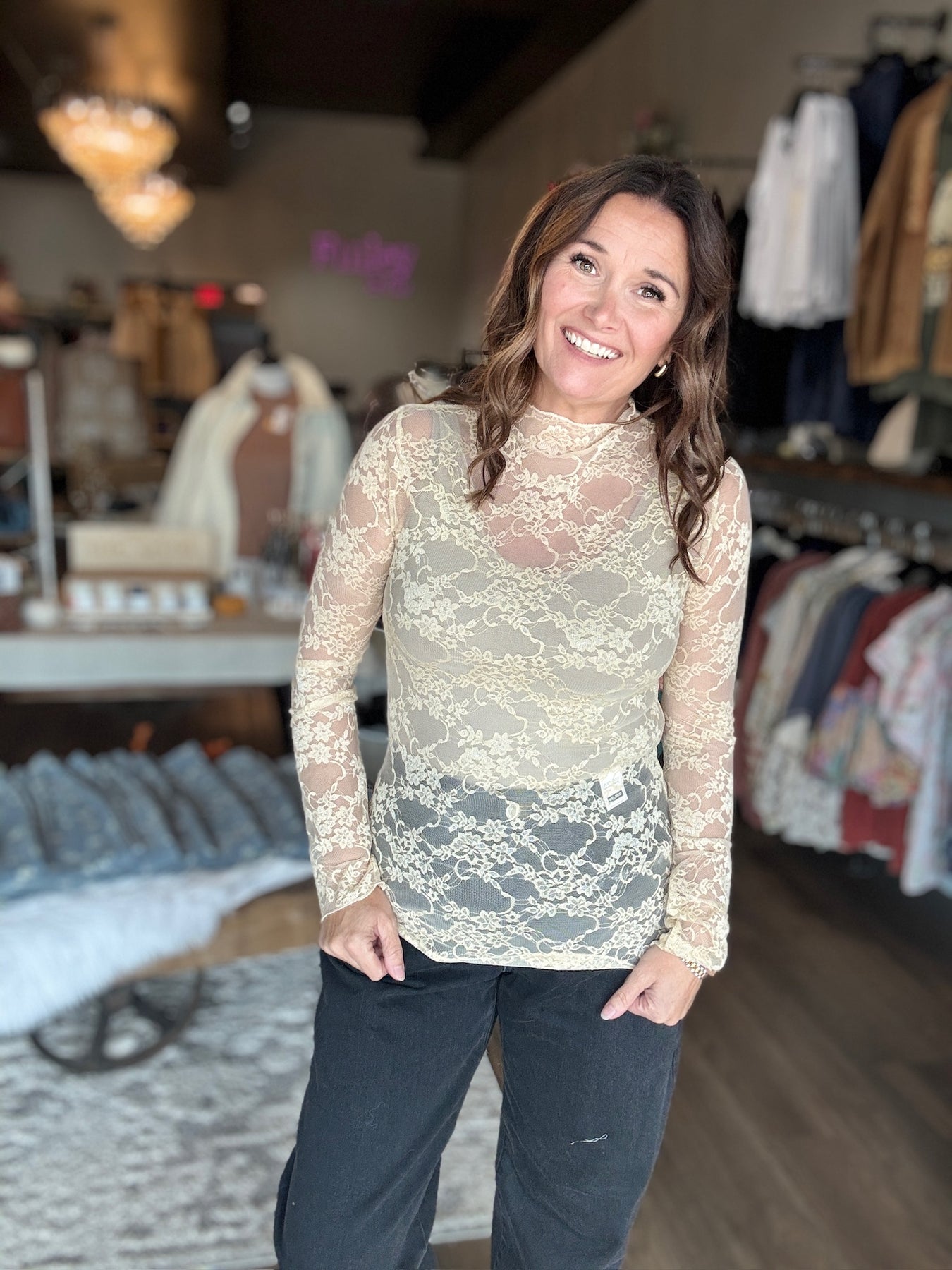 Elevate your layering game with this Ivory Mock Neck Lace Top. Its delicate lace adds a touch of whimsy, while the mock neck brings a chic, cozy vibe. Perfect for mixing and matching, this top brightens any outfit with effortless style and playful charm.