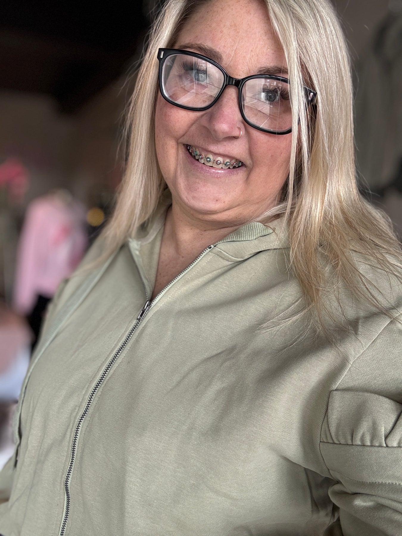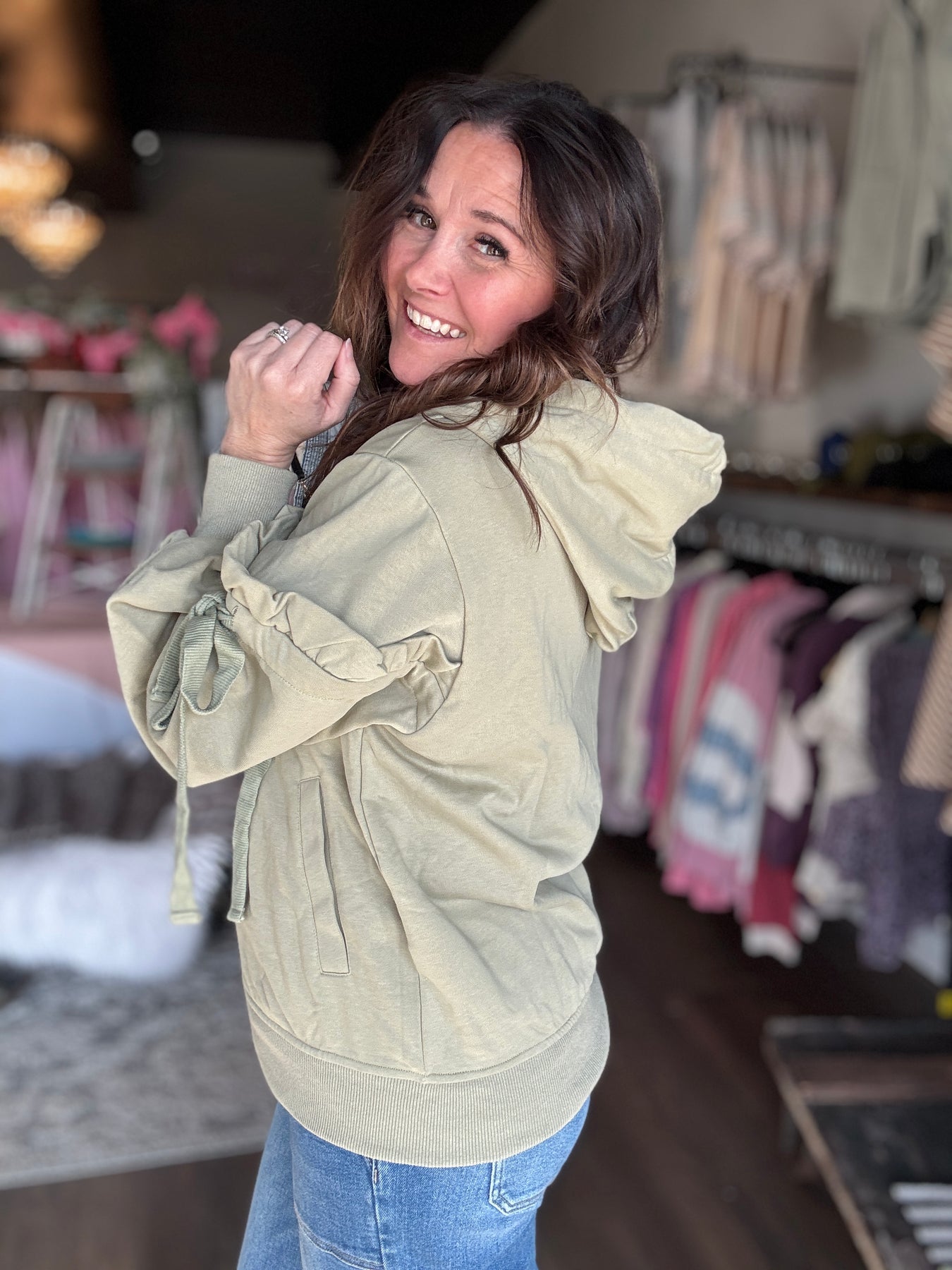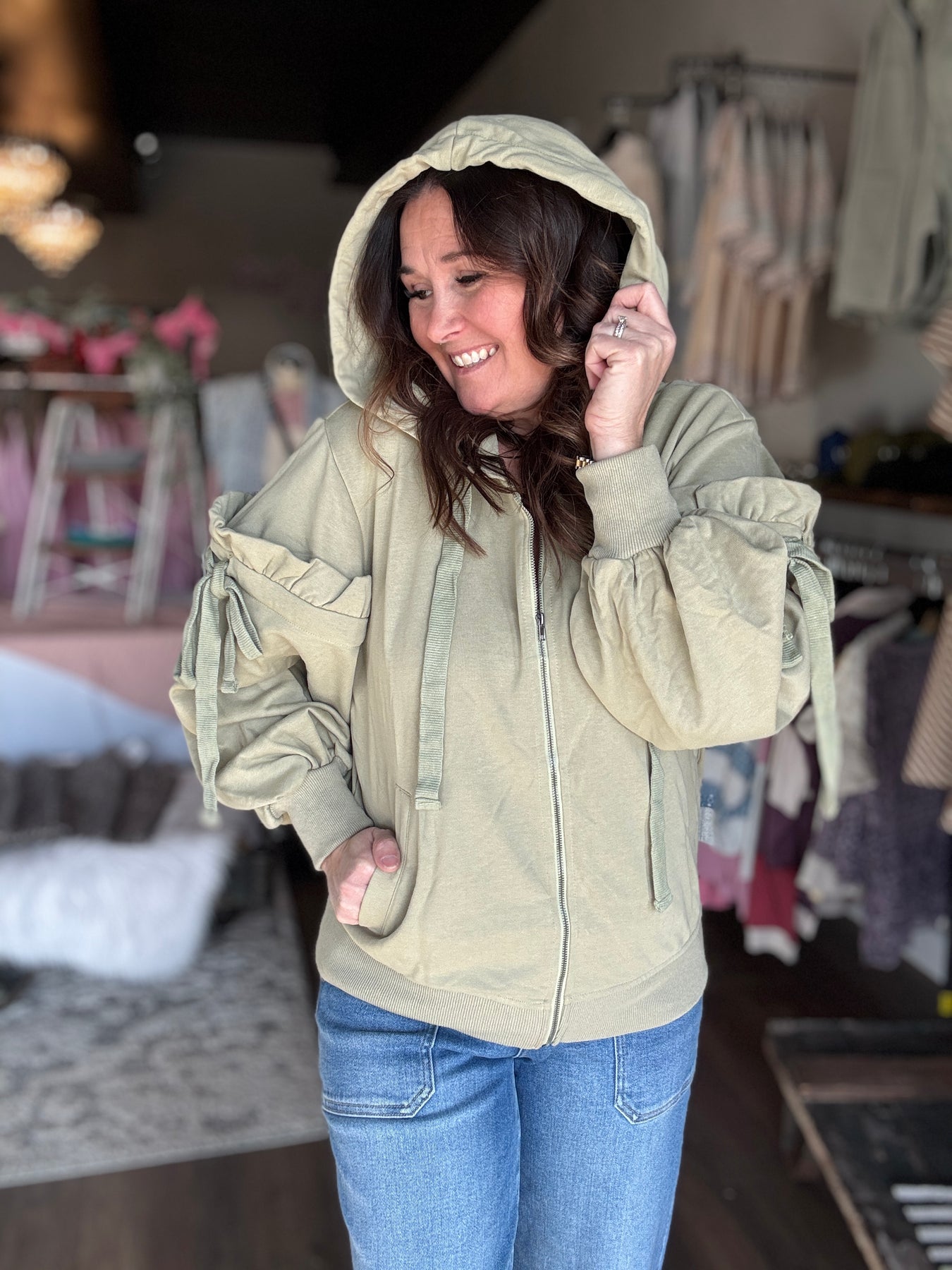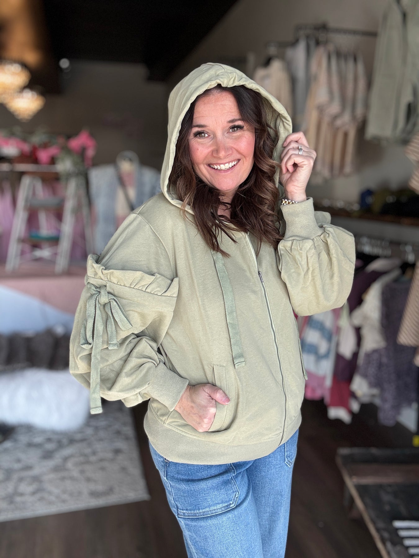 Elevate your spring wardrobe with The Sage Bow Zip Up—a charming hoodie in soft sage green that's as practical as it is adorable. Featuring ruffled puff sleeves with a delicate cinching bow, this piece brings playful flair to casual days. The cozy hood keeps you covered, while functional pockets are perfect for your essentials. Whether you're layering over a tee or wearing solo, this spring essential strikes the perfect balance between comfort and style.