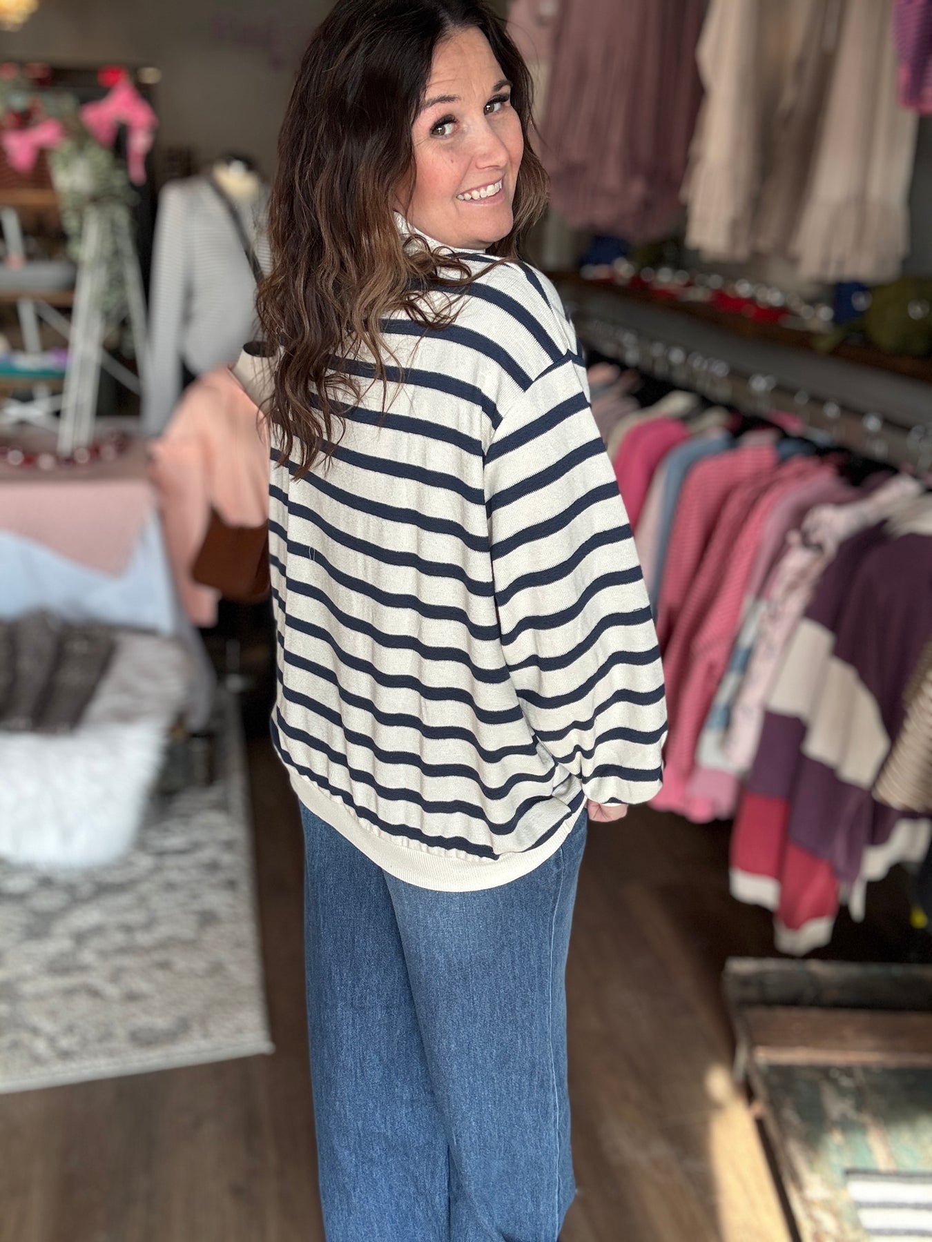 Stripes are having a major moment, and this oversized mock neck sweatshirt is here to prove it. Featuring classic navy and white stripes with a cozy ribbed texture, it's the kind of piece that feels effortlessly put-together. The relaxed fit is perfect for layering as the weather warms up, and here's the best part—pair it with the matching pants to create an instant coordinated look. Spring just got a whole lot easier (and cuter).