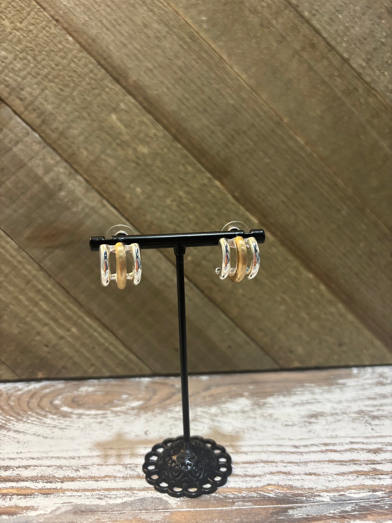 Add a sparkle of fun with these Triple Hoop Stud Earrings! Combining sleek silver and warm gold, these smaller hoops layer effortlessly for a playful yet chic look. Perfect for mixing metals and adding a subtle twist to your everyday style.